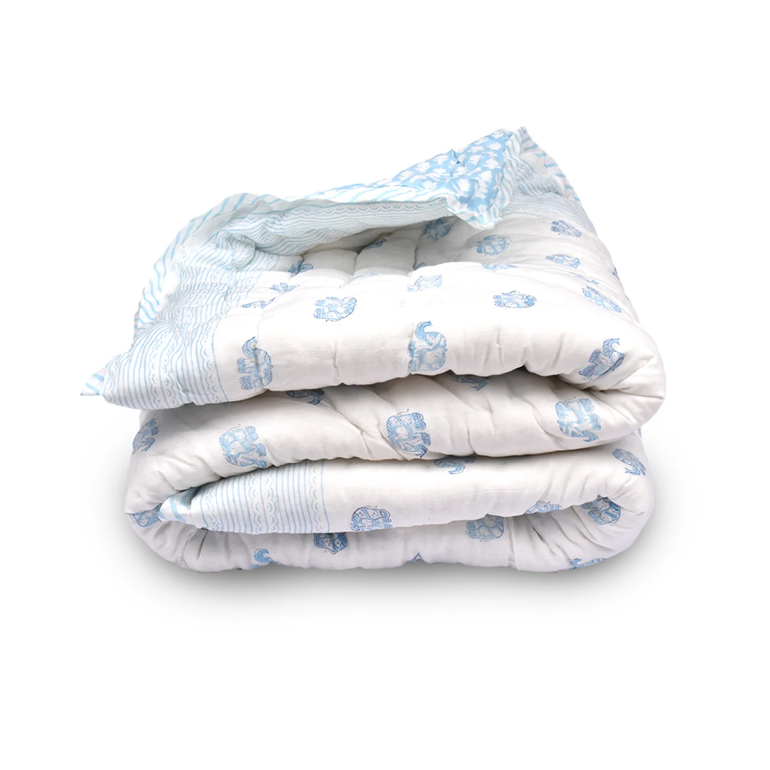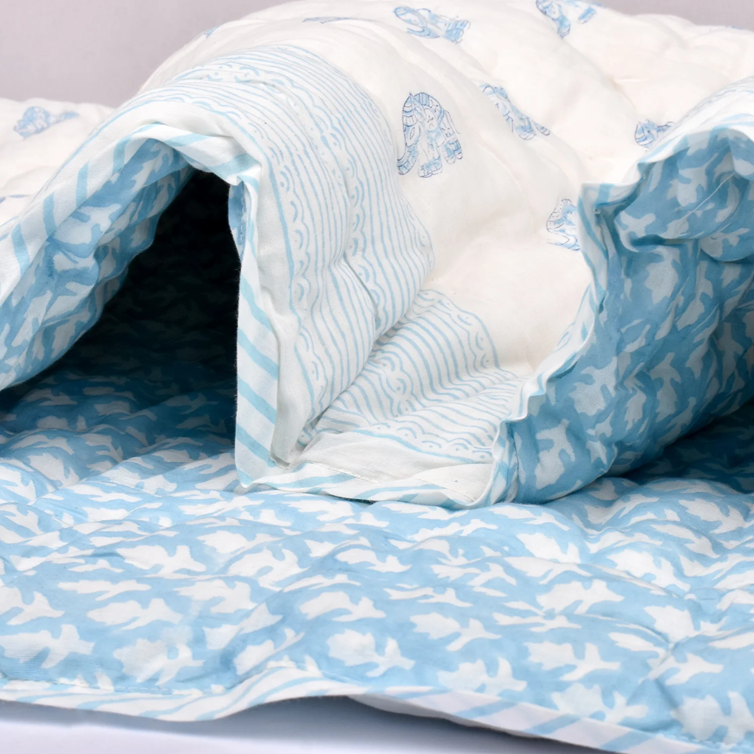 Organic Cotton Baby Muslin Quilt/Blanket Crafted from the purest organic cotton, this exquisitely soft quilt offers unparalleled warmth and coziness, making it the perfect companion for babies aged 0-9 years. Versatile and practical, it serves as a plush kid’s blanket, a stylish travel essential, or a cozy wrap, adapting effortlessly to every need. With eco-friendly dyes and a reversible design, our quilt not only pampers your baby’s delicate skin but also promotes sustainability. Adorned with delightful hand block prints, it makes for a thoughtful and elegant baby shower gift, sure to impress discerning parents-to-be. Experience the ultimate comfort and luxury with Moms Home, where every stitch is infused with love and care.